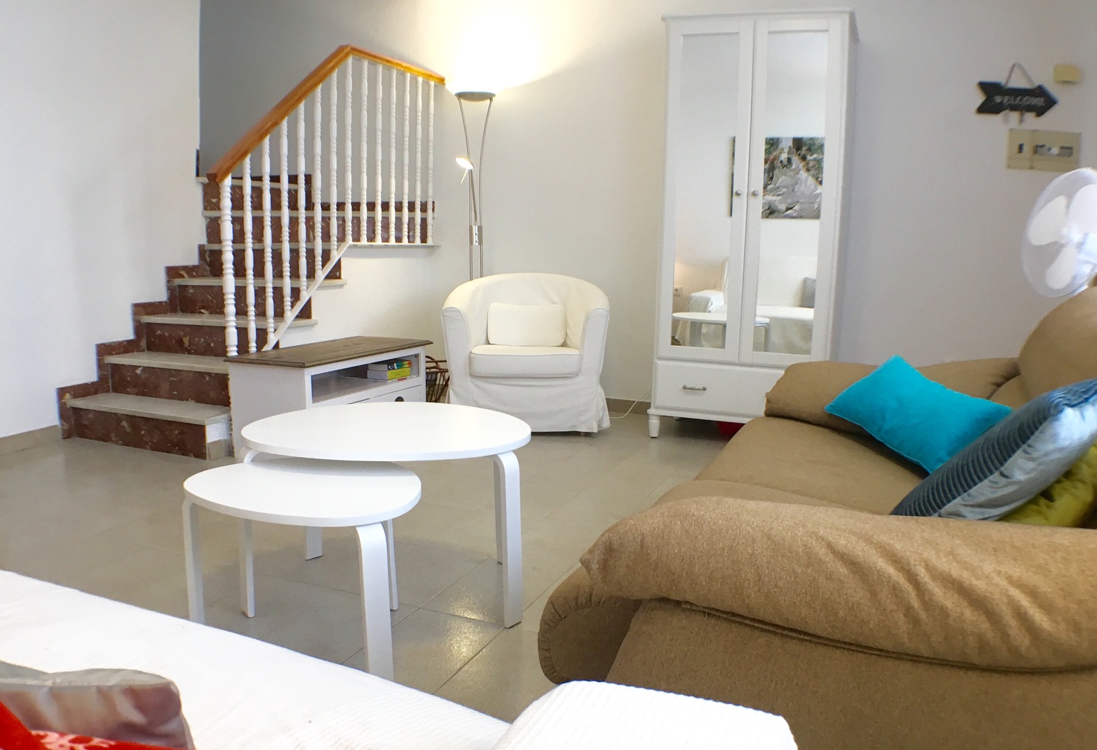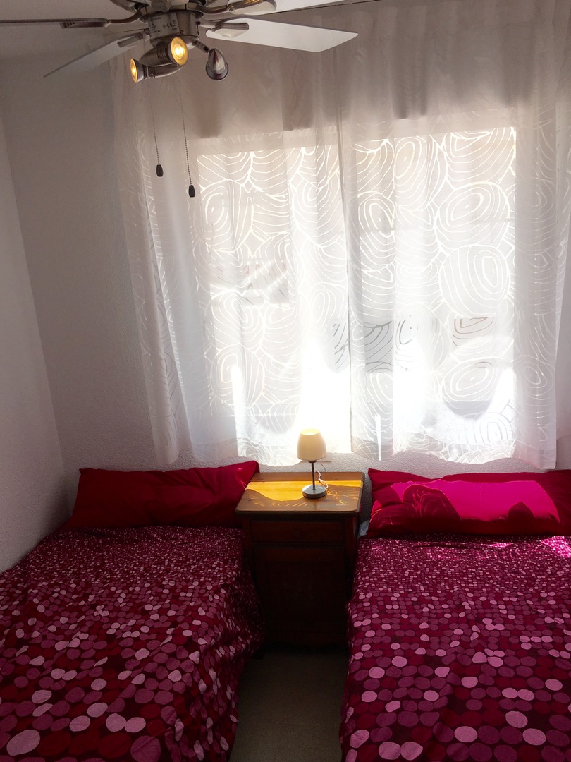 Via a roofed entrance you enter the living room with television and three sofas. On the other side of the groundfloor there is the kitchen and dining room. The backdoor of the kitchen opens to a patio with another table, barbecue and a shower (warm). There is also a bathroom with a shower on the groundfloor. WLAN is included (gratis). The rooms are equipped with ceiling fans or air conditioning.